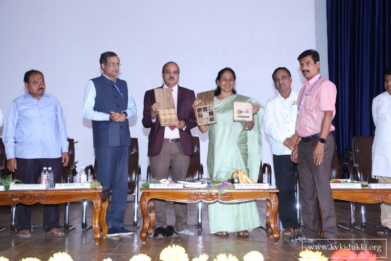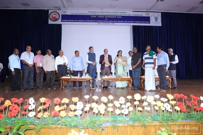 Release of “Kisan Samriddhi” brand of ATARI Zone XI, Bengaluru was done in Zonal workshop of KVK’s 2022 held at University of Agricultural Sciences, Dharwad. Krishi Vigyan Kendra, Idukki from 1995 works for the farming community of Idukki district. Idukki district is the spice bowl of Kerala, mainly Small cardamom, Black pepper, Nutmeg, Cloves, Cinnamon and alike. Since past 25 years Krishi Vigyan Kendra, Idukki mainly focus on the upliftment of Spice farmers with latest innovative technologies. Krishi Vigyan Kendra, Idukki has initiated the registration and received the trademarking for the brand named “Kisan Samriddhi” in 5 classes in the name of The Director, ATARI, Zone XI, Bengaluru. The logo was designed as per the norms and condition by KVK Idukki. Sushri Shobha Karandlaje, Honorable Minister of State Agriculture and farmer’s welfare, Government of India, New Delhi released the logo of Kisan Samriddhi during the Annual Zonal workshop of KVK’s held at UAS, Dharwad on 19.06.2022. A Kisan Samriddhi Spice box developed by Krishi Vigyan Kendra, Idukki comprising different spices from Idukki district was also released during the event.