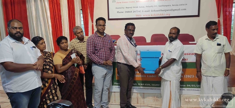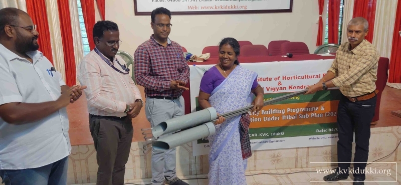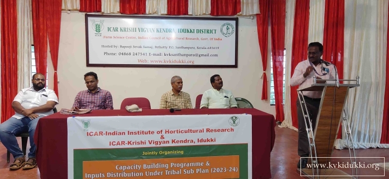 The programme was jointly organized by ICAR Krishi Vigyan Kendra (KVK), Idukki and ICAR- IIHR, Bengaluru for benefiting the tribal farmers of Aruvilamchal Hamlet in Nedumkandam block of Idukki district on 04.1.24. The program was inaugurated by Dr. R. Marimuthu, Senior Scientist and Head, KVK Idukki. During the program technological inputs like seeds of Tomato (A. Rakshak, A. Samarat, A. Abhed, A. Apesksha), Chilli (A. Kyati, A. Gagana,A. Haritha,A. Meghana,A. Sanvi,A. Shweta,) Brinjal (A. Anand, A. Harshita), Okra (A. Nikita, A. Anamika), Pumpkin (A. Suryamukhi),Yard long Bean (A. Mangala), Palak (A. Anupama), Veg. Amaranths (A. Arunima, A. Suguna), Dolichos (A. Jay,A. Sambram, A. Krishna,A. Visthar,A. Adarsh), French bean (A. Komal, A. Suvidha),Bottle guard (A. Bahar),Ridge guard (A. Prasan, A. Vikram),Coriander (A. Isha),Radish (A. Nishanth),Vegetable seed kit for nutrigarden, seedlings of Dragon fruit, Mango (Alphonsa, Mallika, Raspuri, Banganpalli),Annona (Arka Sahan), Pseudomonas, Paecilomyces, micronutrient mixtures like Vegetable special, biopesticides like Neem soap, implements like Lemon harvesters, Mango harvesters and Biofertilizers were provided to 100 tribal farmers of Aruvilamchal Hamlet in Idukki Dr. Selvakumar G, Principal Scientist (Agricultural Microbiology), elaborated on the major activities of ICAR-IIHR Bengaluru. Dr. D. Kalaivanan, Senior Scientist (Soil Science) from ICAR IIHR-, Bengaluru elaborated the schemes under tribal sub plan of ICAR –IIHR, Bengluru. Mr. Sudhakar S, SMS (Plant Protection), Project incharge felicitated the programme. Dr S Jayababu, SMS Animal Science, Smt. Manju Jincy Varghese, SMS (Soil Science), Biju Narayanan, Programme Assistant(Computer) from KVK, Idukki participated in the programme. Dr. D. Kalaivanan, Nodal Officer of Tribal Sub Plan (TSP) Scheme, ICAR-IIHR, Bengaluru and Mr. Sudhakar S, SMS (Plant Protection), Project incharge coordinated the programme.