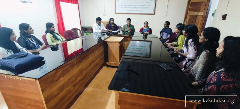 The ICAR–Krishi Vigyan Kendra, Idukki successfully conducted a five-week Rural Agricultural Work Experience (RAWE) Programme for eight undergraduate students from the Faculty of Agriculture, University of Agricultural Sciences, Guru Kashi, Punjab in the leadership of Ms. Preethu K. Paul, SMS Agricultural Extension and RAWE coordinator. The programme aimed to provide hands-on exposure to real-life agricultural situations, farming systems, rural livelihoods, extension methodologies, and technology transfer mechanisms practiced in the unique high-range ecosystem of Idukki district. The students were oriented to the various developmental, research, training, and extension activities of KVK Idukki, including on-farm trials, frontline demonstrations, farmer training programmes, agri-entrepreneurship promotion initiatives, and the dissemination of climate-smart and location-specific agricultural practices. As part of the field immersion activities, the students undertook structured field visits to farming communities and institutions to understand the production constraints, resource utilization strategies, marketing channels, and technology adoption patterns in the region. One of the major exposure visits during the RAWE programme was to the High Range Dairy Cooperative Society, Sengulam, Idukki, which provided valuable insights into cooperative functioning and the organized dairy sector of the high-range region. Throughout the five-week programme, the students actively participated in field-based learning, case studies, report preparation, participatory data collection, and interaction with farming households. The programme enriched their understanding of location-specific agricultural challenges and provided valuable experience in grassroots extension activities. The RAWE programme concluded with presentations and feedback sessions, where the students shared their learning outcomes, observations, and suggestions.